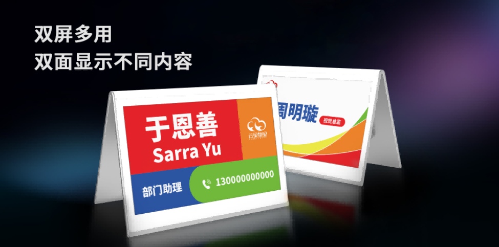不同于市面上常見的打印裁切的A4紙質(zhì)桌牌,RS075V采用雙面電子墨水屏,電子墨水屏可顯示“黑白紅黃藍(lán)綠橙”等七種顏色,告別傳統(tǒng)紅紙黑字的A4紙質(zhì)打印桌牌,RS075V在內(nèi)容顏色顯示上有了更多的自由空間。